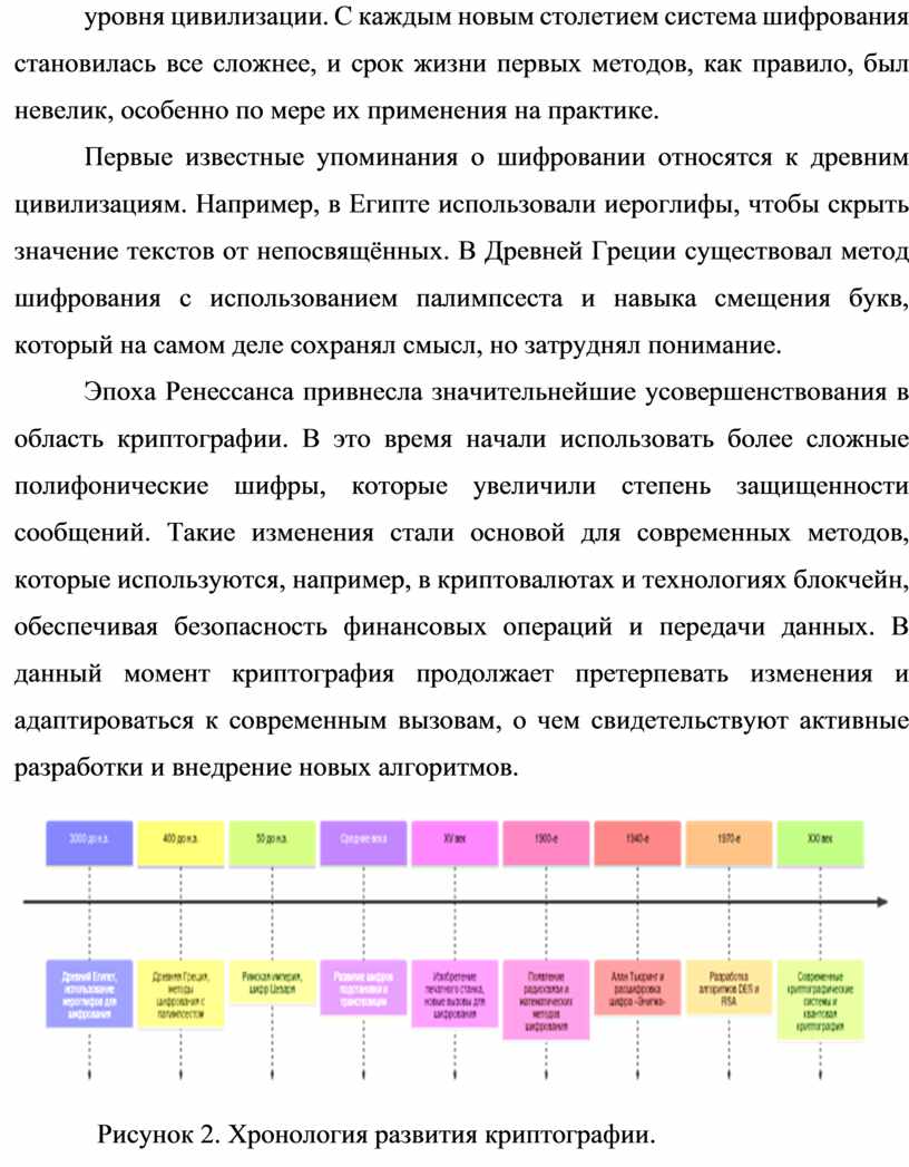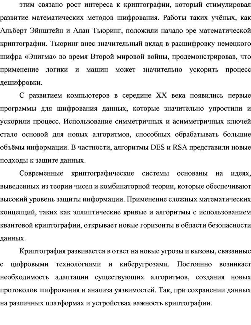 В рамках данной работы будут освещены ключевые темы, касающиеся как исторического аспекта криптографии, так и современных алгоритмов шифрования. Мы начнем с изучения истории криптографии, что позволит понять, как развивались методы шифрования и какие вызовы стояли перед учеными и практиками в разные эпохи. Далее мы перейдем к современным алгоритмам шифрования, таким как AES (Advanced Encryption Standard) и RSA (Rivest-Shamir-Adleman), которые являются основой для большинства современных систем защиты данных.