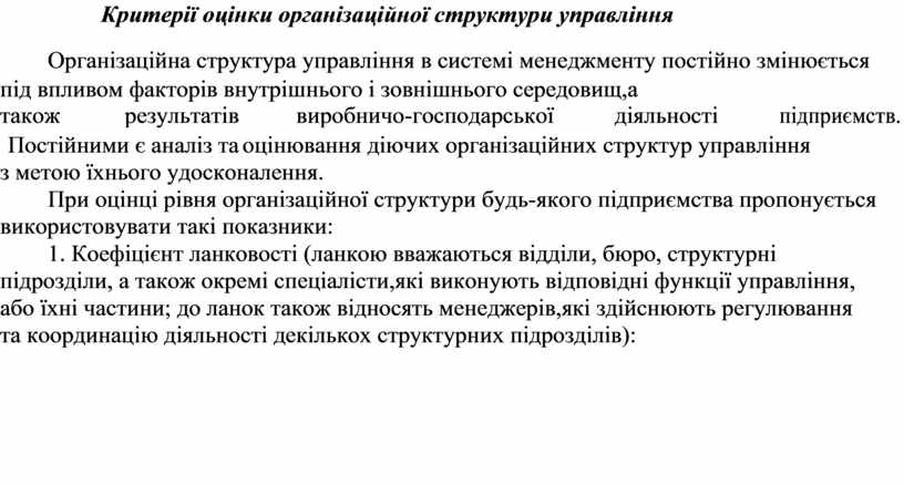 При оцінці рівня організаційної структури будь-якого підприємства пропонується використовувати такі показники: