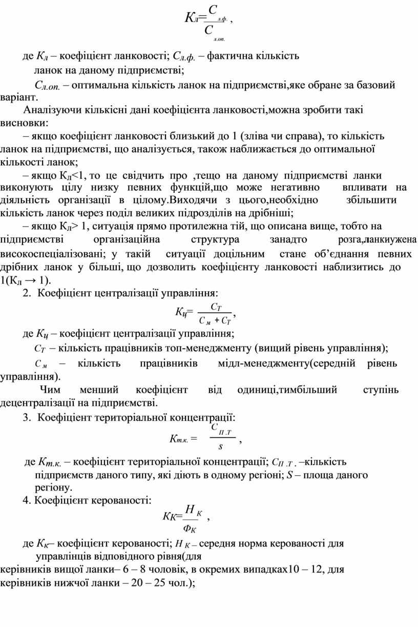 1. Коефіцієнт ланковості (ланкою вважаються відділи, бюро, структурні підрозділи, а також окремі спеціалісти,які виконують відповідні функції управління, або їхні частини; до ланок також відносять менеджерів,які здійснюють регулювання та координацію діяльності декількох структурних підрозділів):