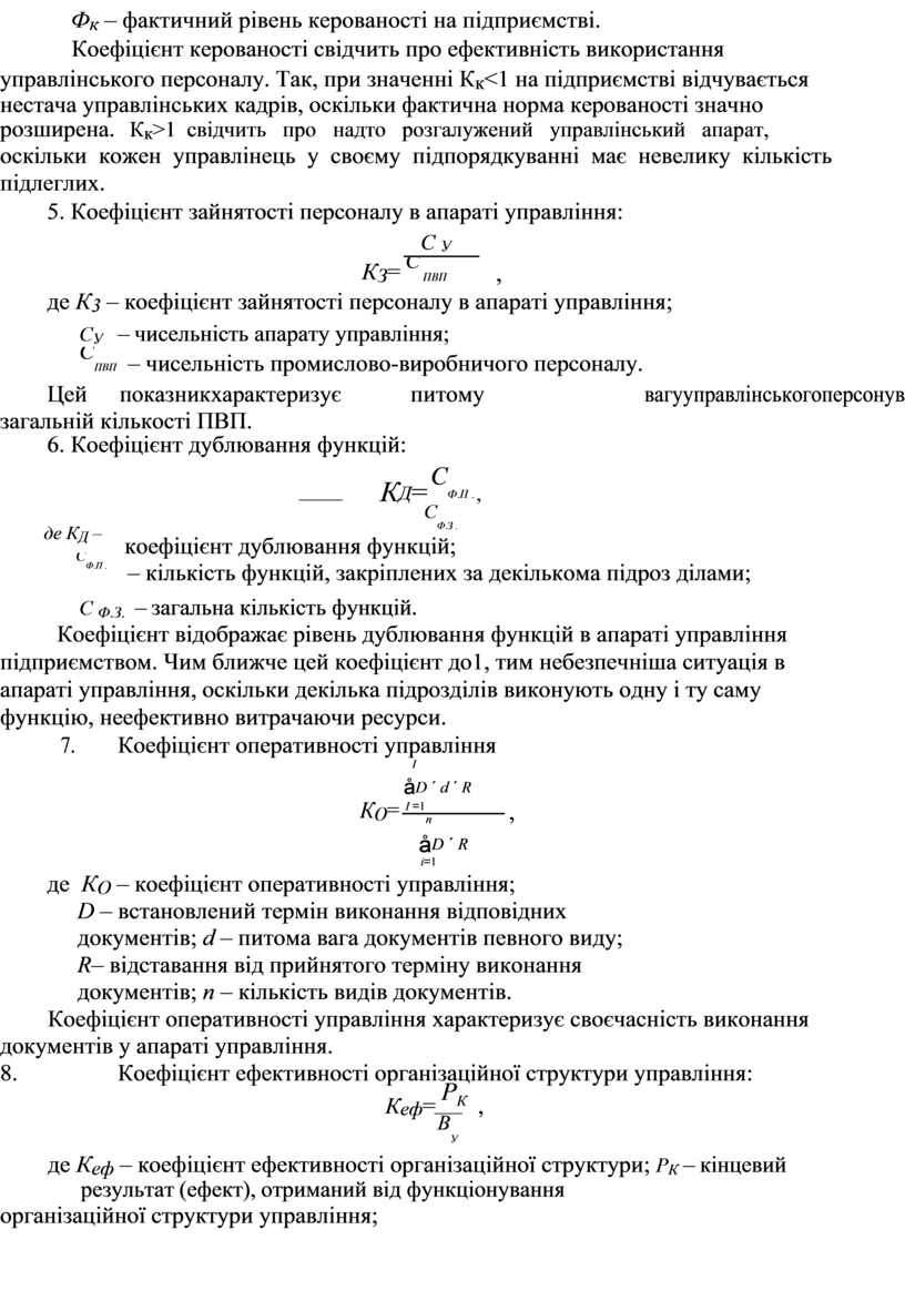 Коефіцієнт відображає рівень дублювання функцій в апараті управління підприємством. Чим ближче цей коефіцієнт до1, тим небезпечніша ситуація в апараті управління, оскільки декілька підрозділів виконують одну і ту саму функцію, неефективно витрачаючи ресурси.