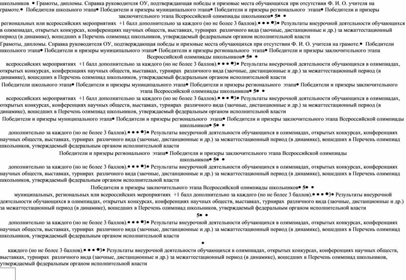 Грамоты, дипломы. Справка руководителя ОУ, подтверждающая победы и призовые места обучающихся при отсутствии Ф. И. О. учителя на грамоте. |