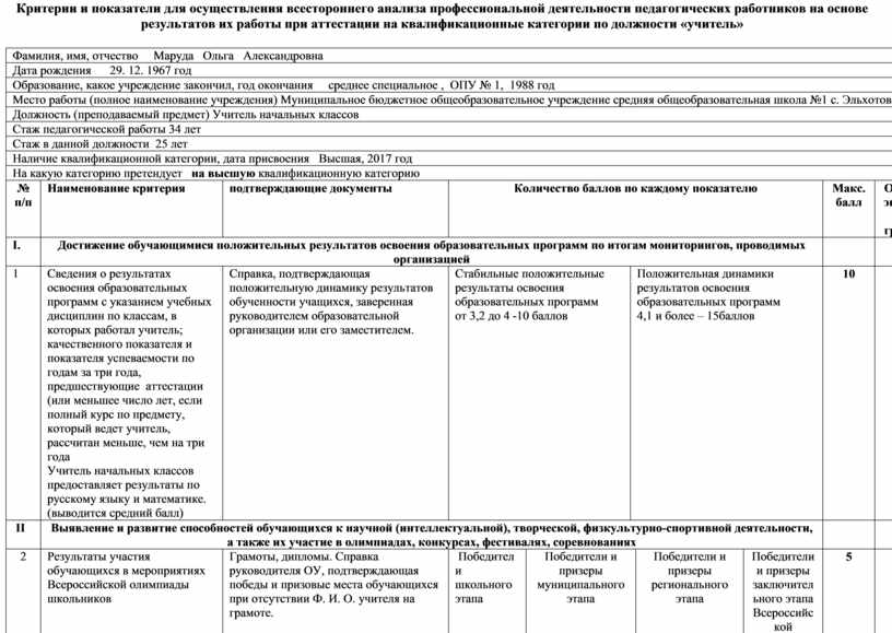 Критерии и показатели для осуществления всестороннего анализа профессиональной деятельности педагогических работников на основе результатов их работы при аттестации на квалификационные категории по должности «учитель»