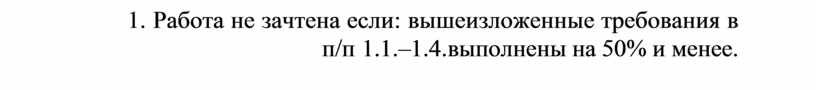 2. Работа не зачтена если: вышеизложенные требования в п/п 1.1.–1.4. выполнены на 50% и менее.