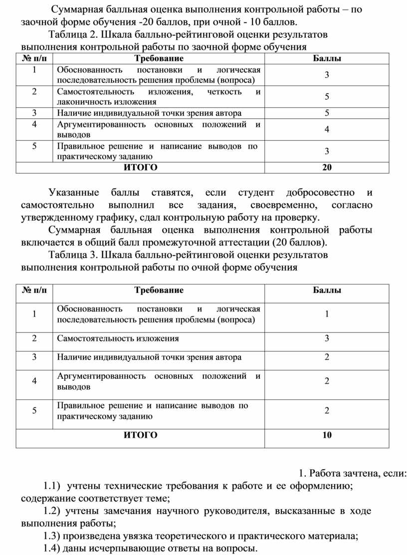 Суммарная балльная оценка выполнения контрольной работы – по заочной форме обучения -20 баллов, при очной - 10 баллов.
