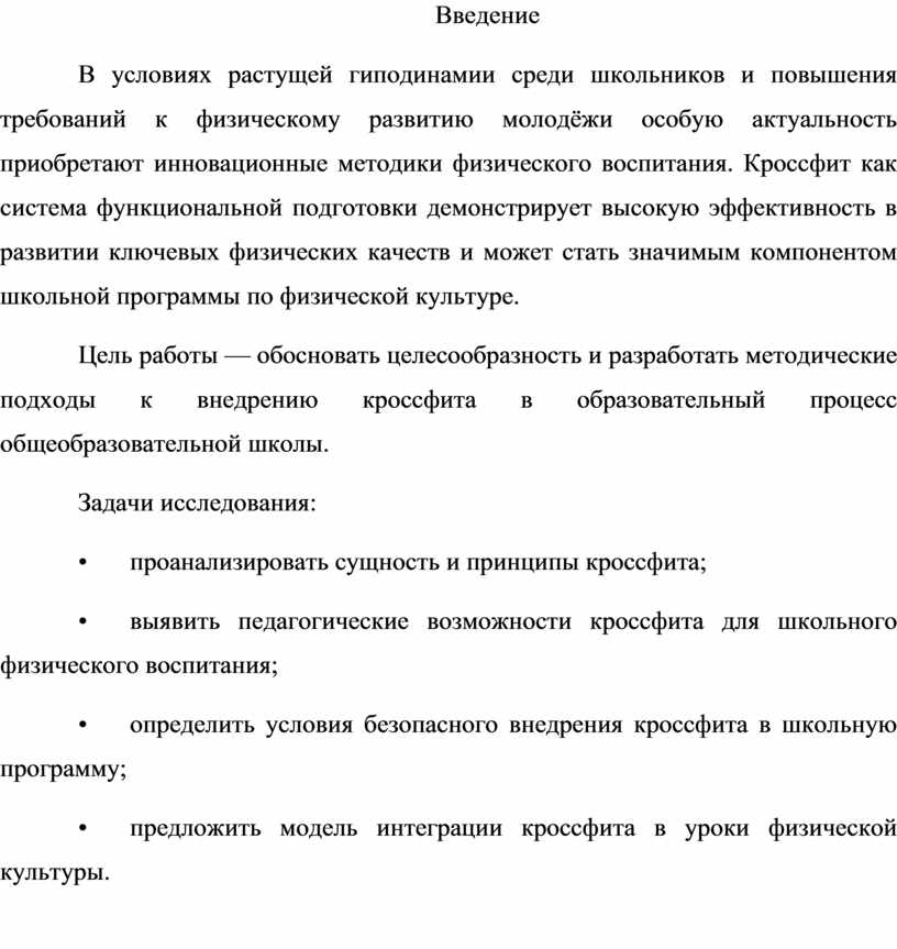 Цель работы — обосновать целесообразность и разработать методические подходы к внедрению кроссфита в образовательный процесс общеобразовательной школы.
