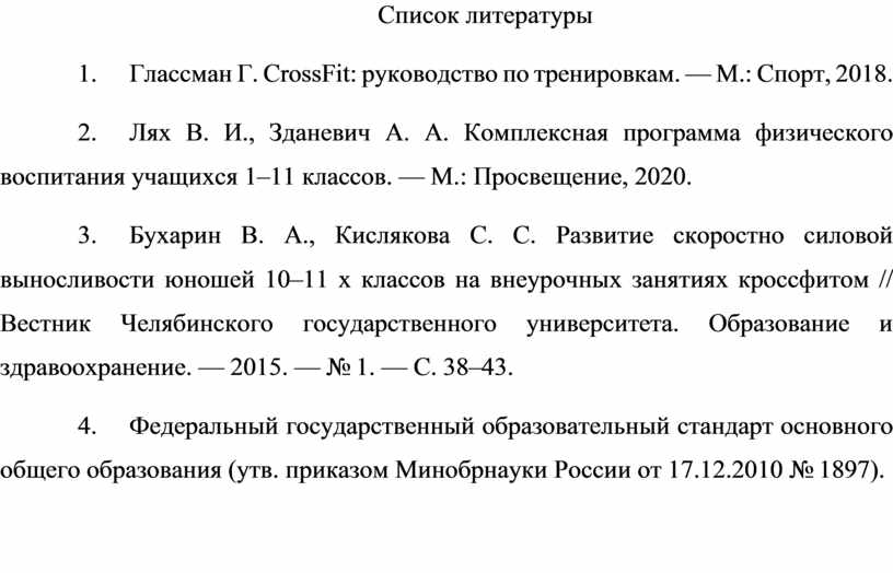 3. Бухарин В. А., Кислякова С. С. Развитие скоростно силовой выносливости юношей 10–11 х классов на внеурочных занятиях кроссфитом // Вестник Челябинского государственного университета. Образование и здравоохранение. — 2015. — № 1. — С. 38–43.