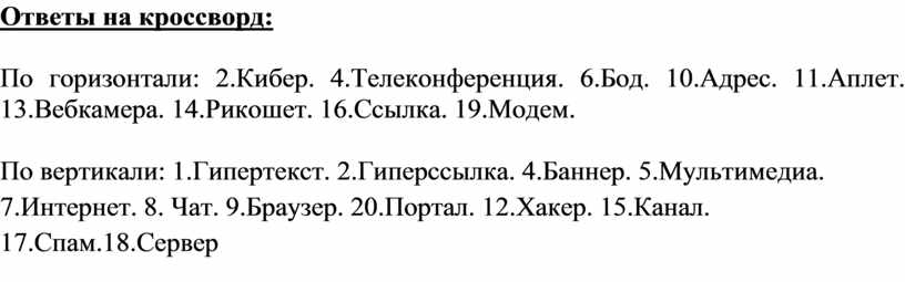 По горизонтали: 2.Кибер. 4.Телеконференция. 6.Бод. 10.Адрес. 11.Аплет. 13.Вебкамера. 14.Рикошет. 16.Ссылка. 19.Модем.