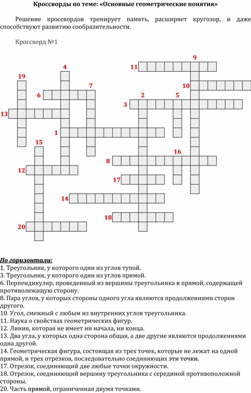по горизонтали: 1.Тупоугольный 3.Прямоугольный 6.Высота 8.Вертикальные 10.Внешний 11.Геометрия 12.Прямая 13.Смежные 14.Треугольник 17.Хорда 18.Медиана 20.Отрезок |