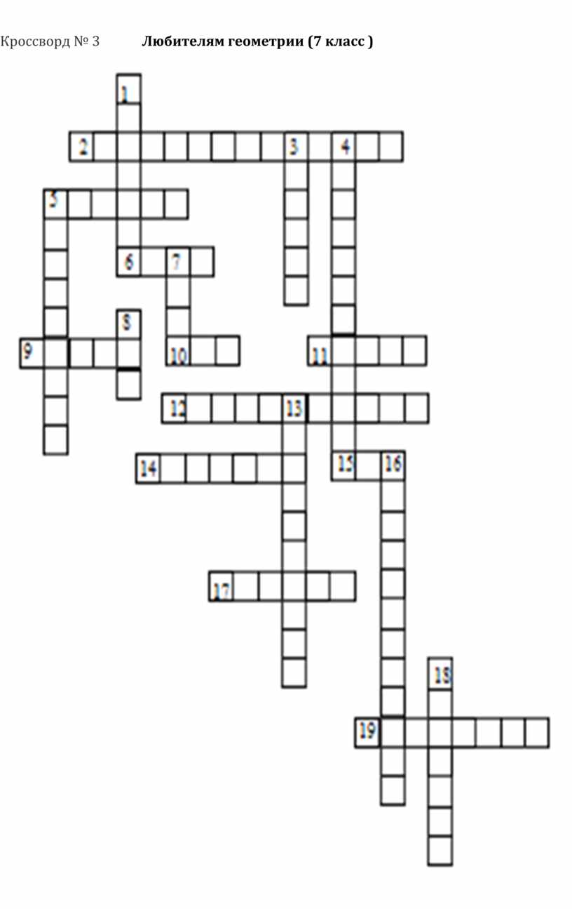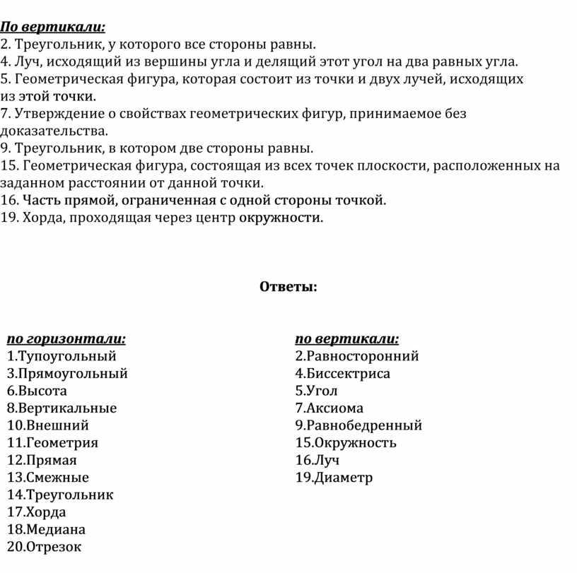 по вертикали: 2.Равносторонний 4.Биссектриса 5.Угол 7.Аксиома 9.Равнобедренный 15.Окружность 16.Луч 19.Диаметр