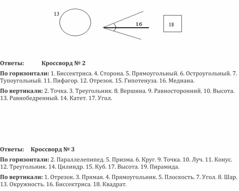 По вертикали: 1. Отрезок. 3. Прямая. 4. Прямоугольник. 5. Плоскость. 7. Угол. 8. Шар. 13. Окружность. 16. Биссектриса. 18. Квадрат.