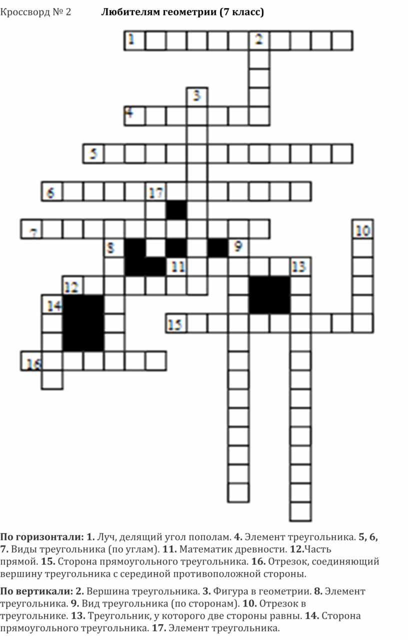 По вертикали: 2. Точка. 3. Треугольник. 8. Вершина. 9. Равносторонний. 10. Высота. 13. Равнобедренный. 14. Катет. 17. Угол.
