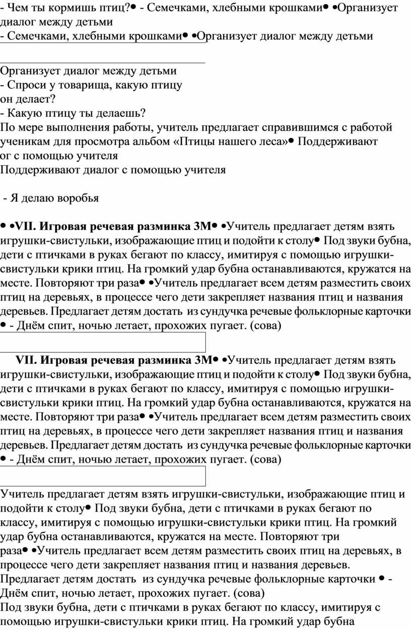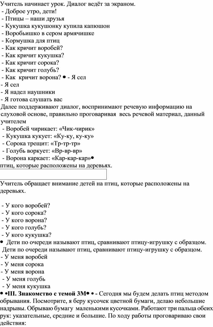 - Я сел - Я надел наушники - Я готова слушать вас Далее поддерживают диалог, воспринимают речевую информацию на слуховой основе, правильно проговаривая весь речевой материал, данный учителем - Воробей чирикает: «Чик-чирик» - Кукушка кукует: «Ку-ку, ку-ку» - Сорока трещит: «Тр-тр-тр» - Голубь воркует: «Вр-вр-вр» - Ворона каркает: «Кар-кар-кар» |