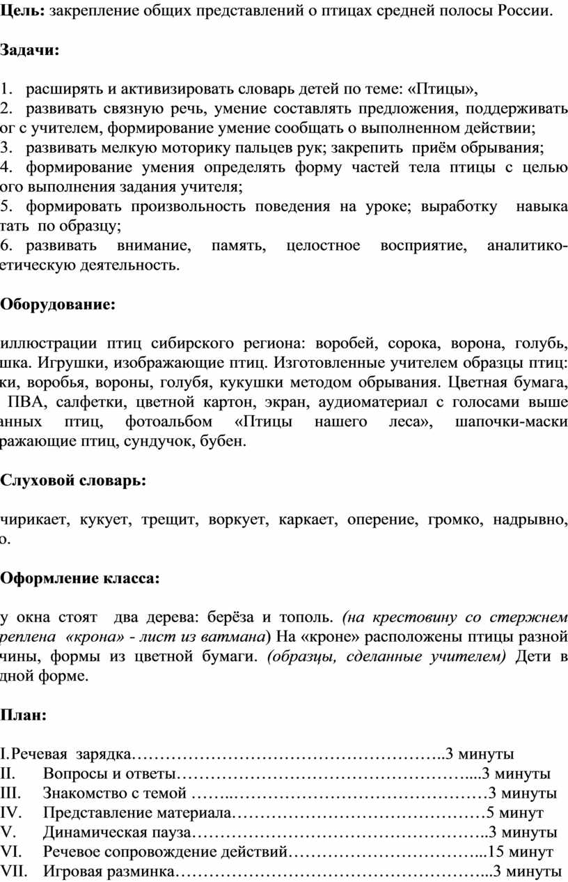 иллюстрации птиц сибирского региона: воробей, сорока, ворона, голубь, кукушка. Игрушки, изображающие птиц. Изготовленные учителем образцы птиц: сороки, воробья, вороны, голубя, кукушки методом обрывания. Цветная бумага, клей ПВА, салфетки, цветной картон, экран, аудиоматериал с голосами выше указанных птиц, фотоальбом «Птицы нашего леса», шапочки-маски изображающие птиц, сундучок, бубен.