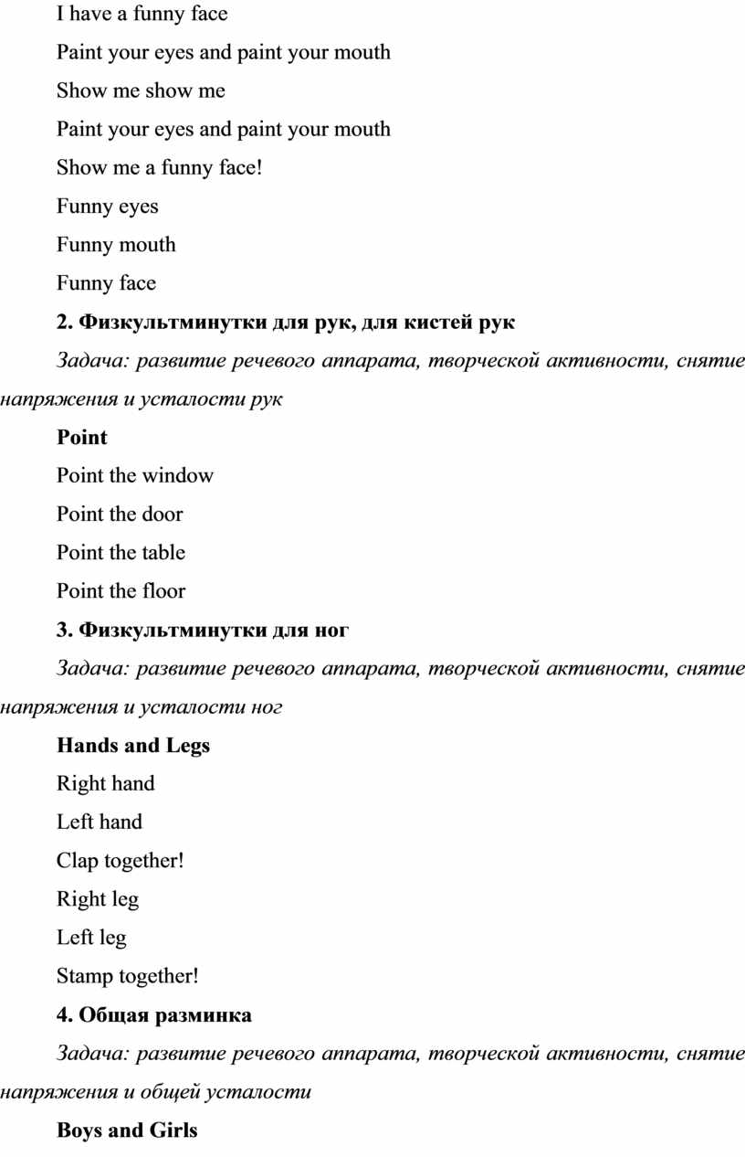 Дети 10 - 13 лет, подростки, особенно нуждаются в движениях. Они растут, развиваются, им трудно отсидеть целый урок, не двигаясь, они быстро устают. Поэтому каждому учителю надо так планировать свой урок, чтобы было время для физкультминутки. На уроках английского языка в 5 - 7 классах проведения физкультминуток-рифмовок, подвижных игр помогает бороться против нарушений осанки и зрения, активизировать память, внимание, умственную работоспособность. Вместе физкультминутки развивают навыки речи, обогащают словарный запас, поддерживают интерес учащихся к изучению английского языка. Стишки, песни, игры способствуют прочному запоминанию слов и словосочетаний. Они разнообразят уроки, делают их интересными. Чтобы ученикам было интересно, эти физкультминутки нужно чередовать, а не повторять одно и то же каждый урок.