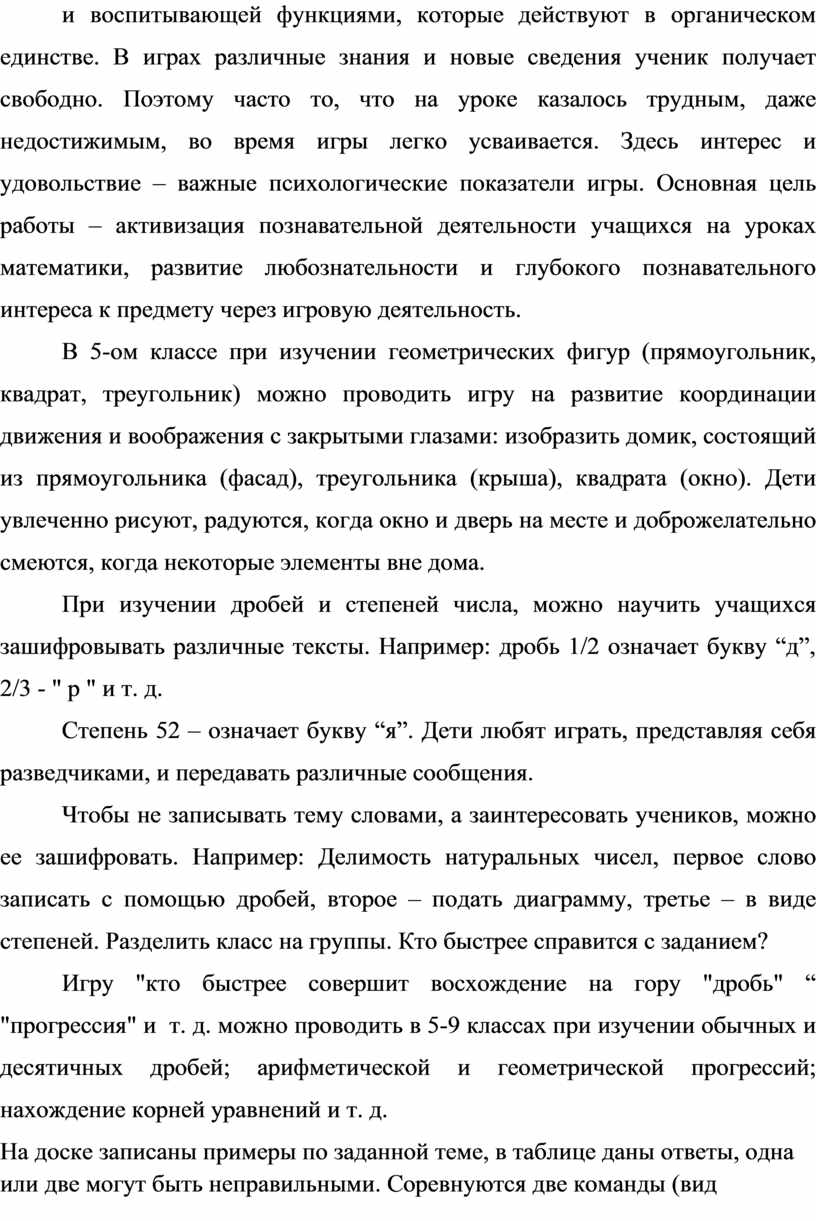 Увеличение умственной нагрузки на уроках математики заставляет задуматься над тем, как поддержать у учащихся интерес к изучаемому материалу, их активность на протяжении всего урока. Немаловажная роль отводится играм на уроках математики – современному и признанному методу обучения и воспитания, обладающему образовательной, развивающей и воспитывающей функциями, которые действуют в органическом единстве. В играх различные знания и новые сведения ученик получает свободно. Поэтому часто то, что на уроке казалось трудным, даже недостижимым, во время игры легко усваивается. Здесь интерес и удовольствие – важные психологические показатели игры. Основная цель работы – активизация познавательной деятельности учащихся на уроках математики, развитие любознательности и глубокого познавательного интереса к предмету через игровую деятельность.