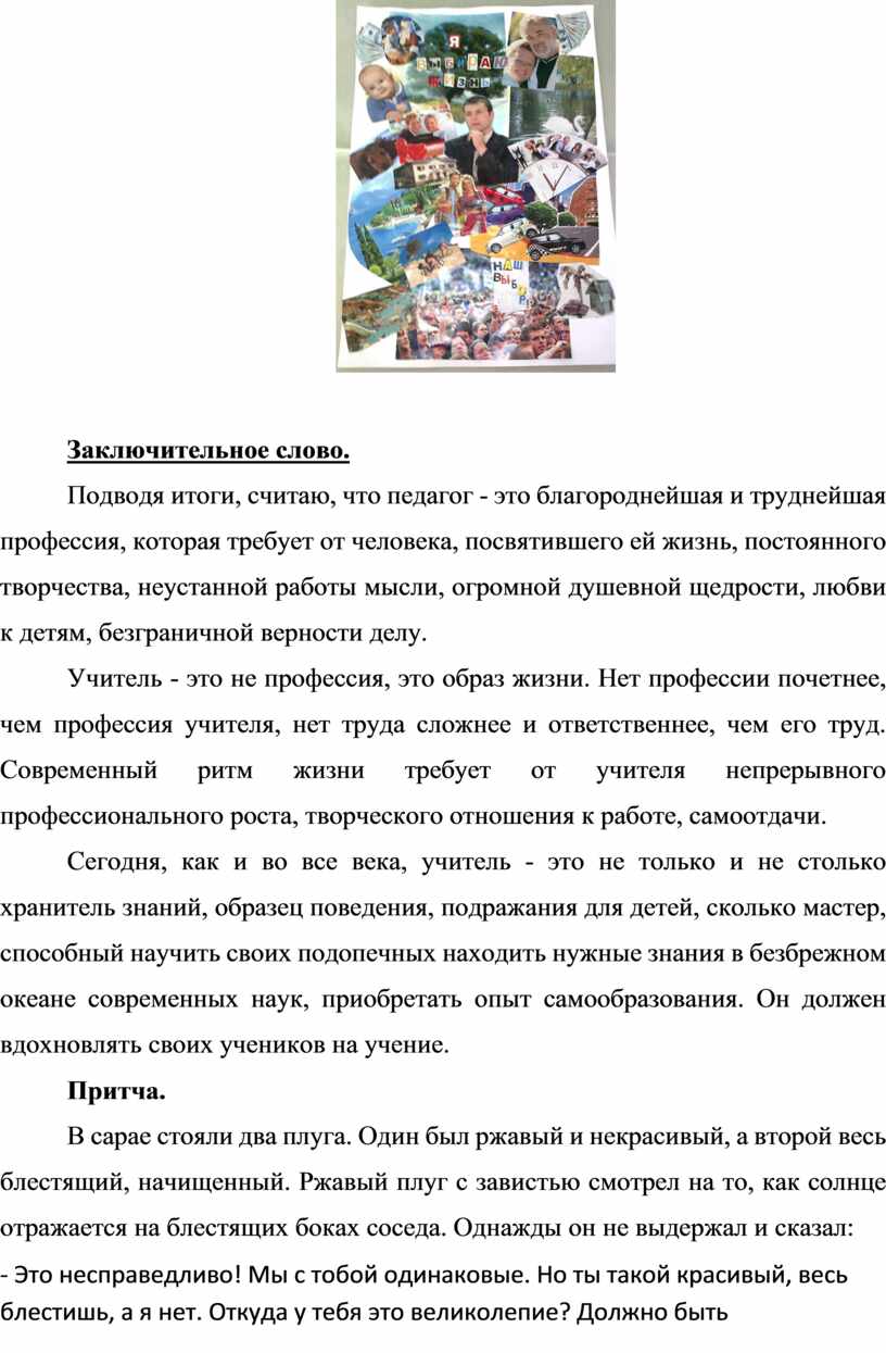 Подводя итоги, считаю, что педагог - это благороднейшая и труднейшая профессия, которая требует от человека, посвятившего ей жизнь, постоянного творчества, неустанной работы мысли, огромной душевной щедрости, любви к детям, безграничной верности делу.