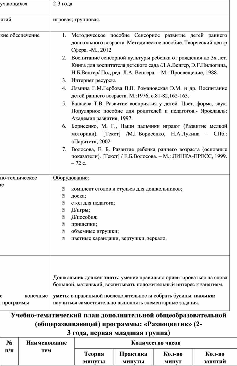 (общеразвивающей) программы: «Разноцветик» (2-3 года, первая младшая группа)