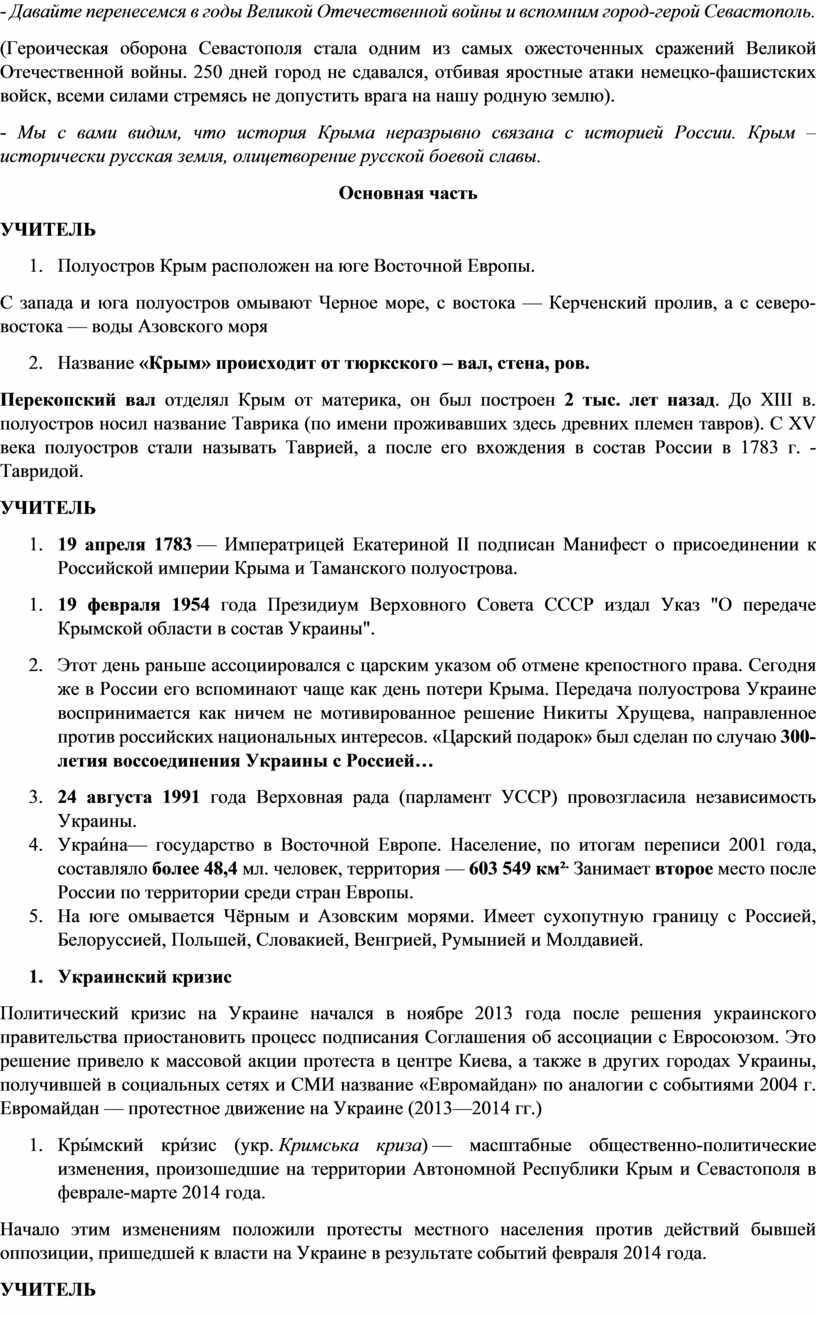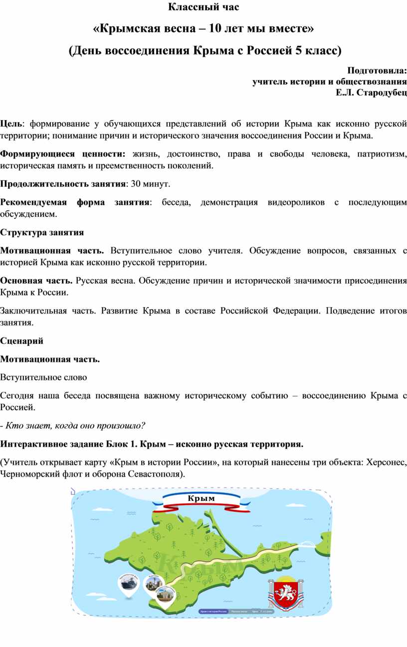 Цель: формирование у обучающихся представлений об истории Крыма как исконно русской территории; понимание причин и исторического значения воссоединения России и Крыма.