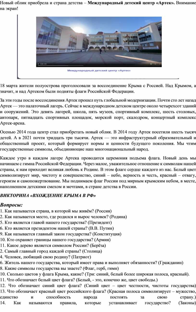 Осенью 2014 года центр стал приобретать новый облик. В 2014 году Артек посетили шесть тысяч детей. А в 2021 почти тридцать три тысячи. Артек — это инфраструктурный образовательный и общественный проект, который формирует нормы и ценности будущего поколения. Мы чтим государственные символы, объединяющие наш многонациональный народ.