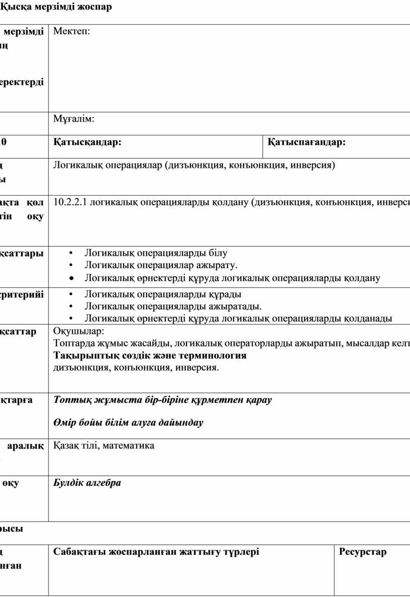 • Логикалық операцияларды білу • Логикалық операциялар ажырату. · Логикалық өрнектерді құруда логикалық операцияларды қолдану |