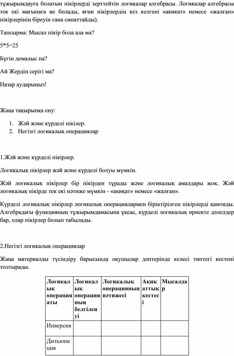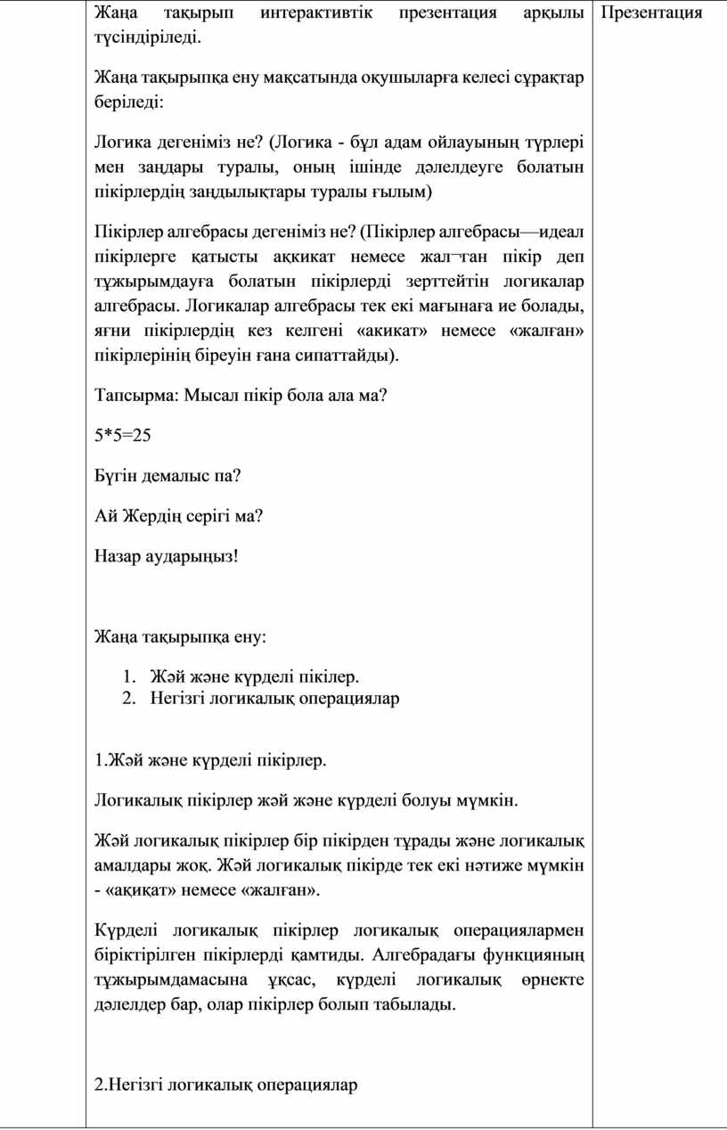 Жаңа тақырып интерактивтік презентация арқылы түсіндіріледі. Жаңа тақырыпқа ену мақсатында оқушыларға келесі сұрақтар беріледі: Логика дегеніміз не? (Логика - бұл адам ойлауының түрлері мен заңдары туралы, оның ішінде дәлелдеуге болатын пікірлердің заңдылықтары туралы ғылым) Пікірлер алгебрасы дегеніміз не? (Пікірлер алгебрасы—идеал пікірлерге қатысты ақкикат немесе жал¬ган пікір деп тұжырымдауға болатын пікірлерді зерттейтін логикалар алгебрасы. Логикалар алгебрасы тек екі мағынаға ие болады, яғни пікірлердің кез келгені «акикат» немесе «жалған» пікірлерінің біреуін ғана сипаттайды). Тапсырма: Мысал пікір бола ала ма? 5*5=25 Бүгін демалыс па? Ай Жердің серігі ма? Назар аударыңыз!