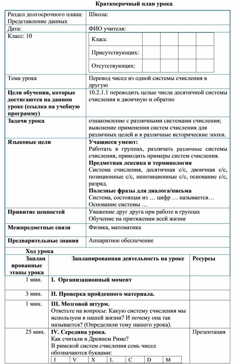 Учащиеся умеют: Работать в группах, различать различные системы счисления, приводить примеры систем счисления. Предметная лексика и терминология Система счисления, десятичная с/с, двоичная с/с, позиционные с/с, непозиционные с/с, основание с/с, разряд. Полезные фразы для диалога/письма Система, состоящая из … цифр … называется… Основание системы … |
