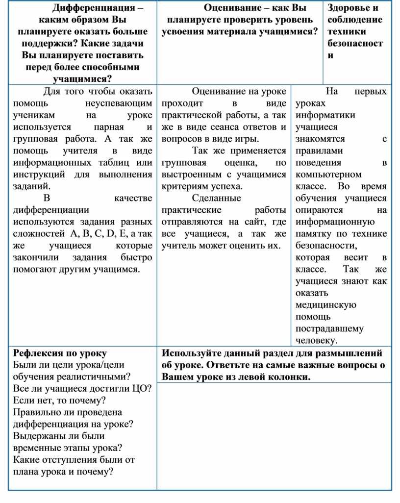 Используйте данный раздел для размышлений об уроке. Ответьте на самые важные вопросы о Вашем уроке из левой колонки. |