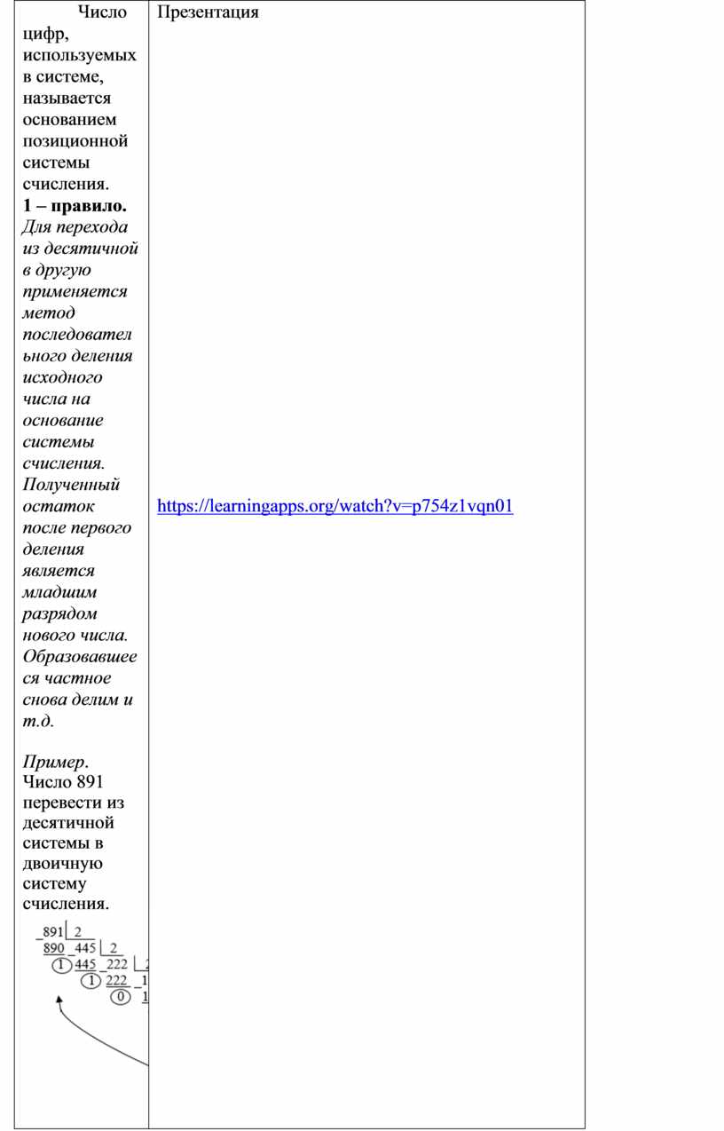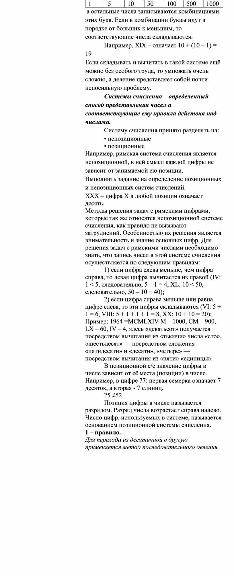 а остальные числа записываются комбинациями этих букв. Если в комбинации буквы идут в порядке от больших к меньшим, то соответствующие числа складываются. Например, XIX – означает 10 + (10 – 1) = 19 Если складывать и вычитать в такой системе ещё можно без особого труда, то умножать очень сложно, а деление представляет собой почти непосильную проблему. Системы счисления – определенный способ представления чисел и соответствующие ему правила действия над числами. Систему счисления принято разделять на: • непозиционные • позиционные Например, римская система счисления является непозиционной, в ней смысл каждой цифры не зависит от занимаемой ею позиции. Выполнить задание на определение позиционных и непозиционных систем счислений. XXX – цифра X в любой позиции означает десять. Методы решения задач с римскими цифрами, которые так же относятся непозиционной системе счисления, как правило не вызывают затруднений. Особенностью их решения является внимательность и знание основных цифр. Для решения задач с римскими числами необходимо знать, что запись чисел в этой системе счисления осуществляется по следующим правилам: 1) если цифра слева меньше, чем цифра справа, то левая цифра вычитается из правой (IV: 1 < 5, следовательно, 5 – 1 = 4, XL: 10 < 50, следовательно, 50 – 10 = 40); 2) если цифра справа меньше или равна цифре слева, то эти цифры складываются (VI: 5 + 1 = 6, VIII: 5 + 1 + 1 + 1 = 8, XX: 10 + 10 = 20); Пример: 1964 =MCMLXIV М – 1000, СМ – 900, LX – 60, IV – 4, здесь «девятьсот» получается посредством вычитания из «тысячи» числа «сто», «шестьдесят» — посредством сложения «пятидесяти» и «десяти», «четыре» — посредством вычитания из «пяти» «единицы». В позиционной с/с значение цифры в числе зависит от её места (позиции) в числе. Например, в цифре 77: первая семерка означает 7 десяток, а вторая - 7 единиц. 25 ≠52 Позиция цифры в числе называется разрядом. Разряд числа возрастает справа налево. Число цифр, используемых в системе, называется основанием позиционной системы счисления. 1 – правило. Для перехода из десятичной в другую применяется метод последовательного деления исходного числа на основание системы счисления. Полученный остаток после первого деления является младшим разрядом нового числа. Образовавшееся частное снова делим и т.д.