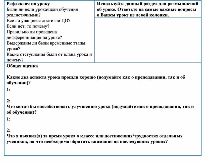 Используйте данный раздел для размышлений об уроке. Ответьте на самые важные вопросы о Вашем уроке из левой колонки. |