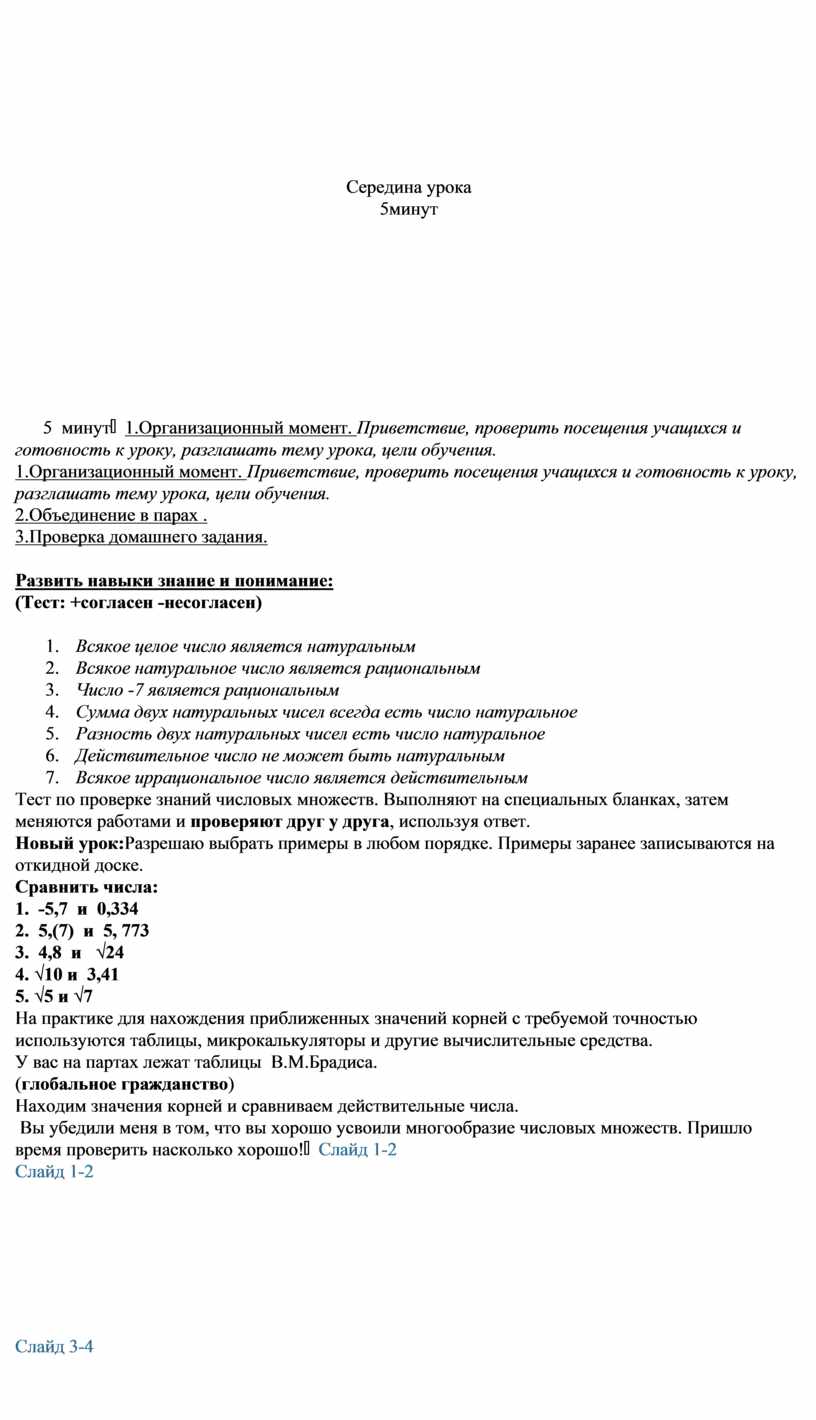 Тест по проверке знаний числовых множеств. Выполняют на специальных бланках, затем меняются работами и проверяют друг у друга, используя ответ. Новый урок:Разрешаю выбрать примеры в любом порядке. Примеры заранее записываются на откидной доске. Сравнить числа: 1. -5,7 и 0,334 2. 5,(7) и 5, 773 3. 4,8 и √24 4. √10 и 3,41 5. √5 и √7 На практике для нахождения приближенных значений корней с требуемой точностью используются таблицы, микрокалькуляторы и другие вычислительные средства. У вас на партах лежат таблицы В.М.Брадиса. (глобальное гражданство) Находим значения корней и сравниваем действительные числа. Вы убедили меня в том, что вы хорошо усвоили многообразие числовых множеств. Пришло время проверить насколько хорошо! |