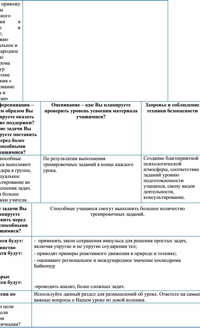 Подведение итогов урокапо целям: - применяю закон сохранения импульса и изменения кинетической энергии при рассмотрении взаимодействиясистемы тел. - привожу примеры реактивного движения в природе и технике; - оцениваю региональное и международное значение космодрома Байконур Д/з Краткие сообщения « Исследование космоса и Казахстан» |