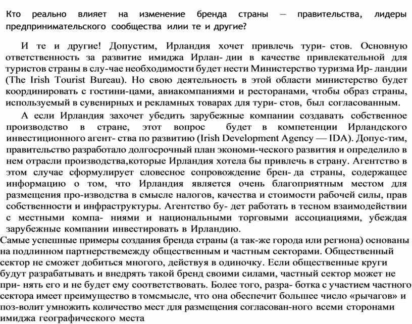 И те и другие! Допустим, Ирландия хочет привлечь тури стов. Основную ответственность за развитие имиджа Ирлан дии в качестве привлекательной для туристов страны в слу чае необходимости будет нести Министерство туризма Ир ландии (The Irish Tourist Bureau). Но свою деятельность в этой области министерство будет координировать с гостини цами, авиакомпаниями и ресторанами, чтобы образ страны, используемый в сувенирных и рекламных товарах для тури стов, был согласованным.