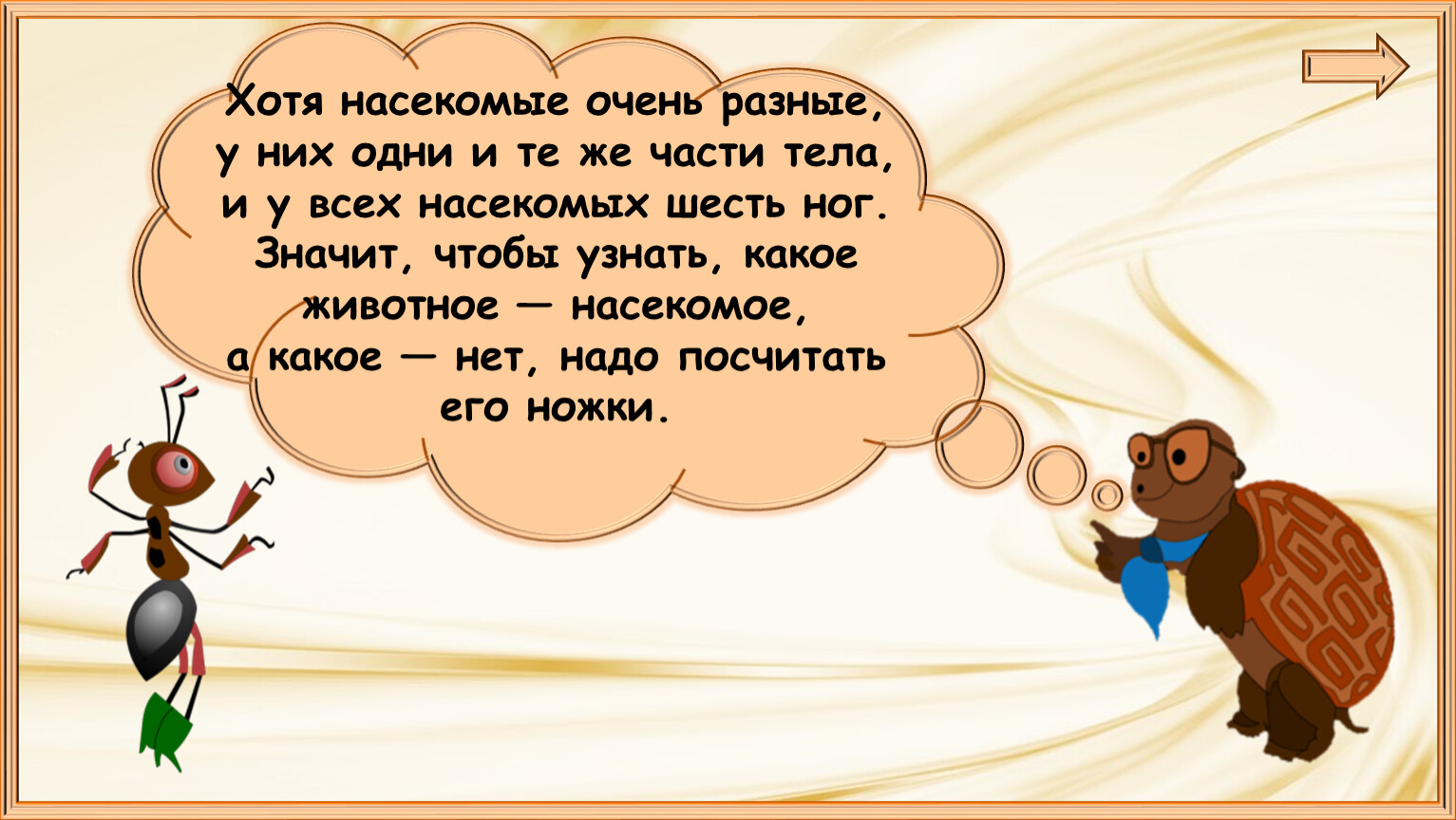 Хотя насекомые очень разные, у них одни и те же части тела, и у всех насекомых шесть ног. Значит, чтобы узнать, какое животное — насекомое, а какое — нет, надо посчитать его ножки.
