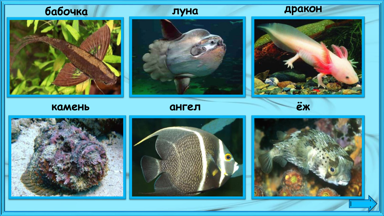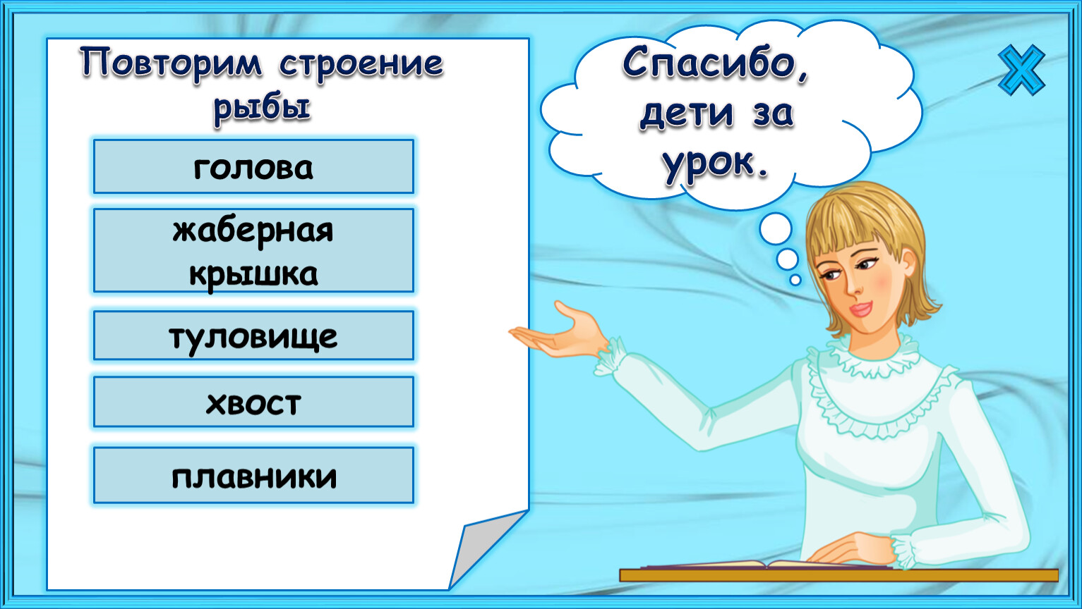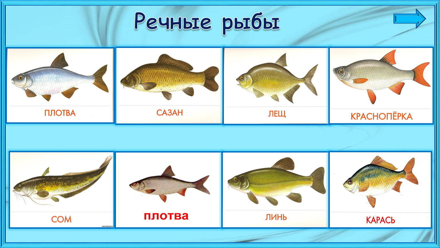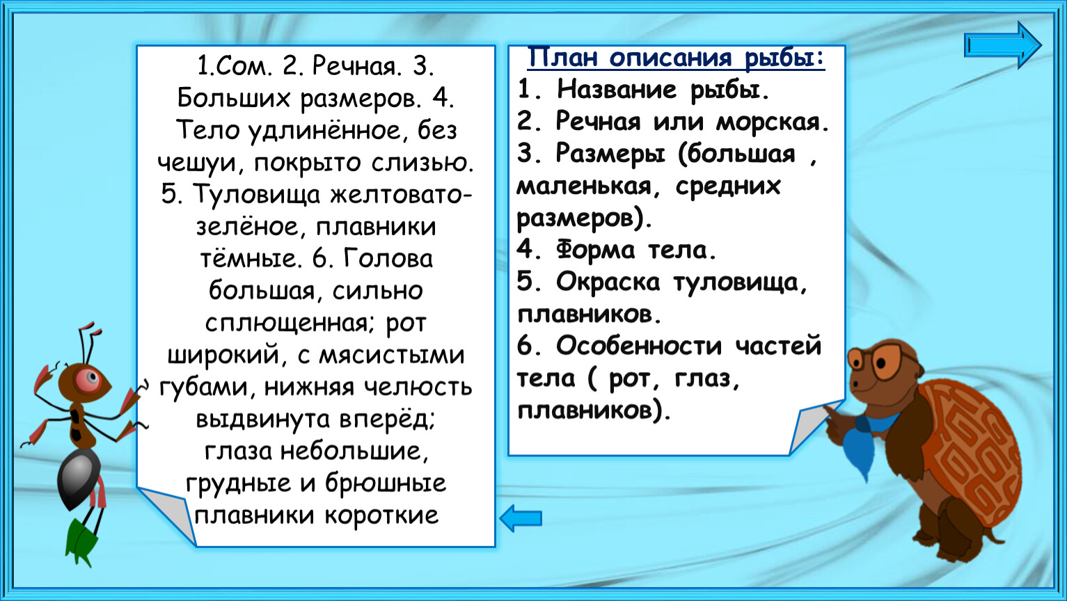 1.Сом. 2. Речная. 3. Больших размеров. 4. Тело удлинённое, без чешуи, покрыто слизью. 5. Туловища желтовато- зелёное, плавники тёмные. 6. Голова большая, сильно сплющенная; рот широкий, с мясистыми губами, нижняя челюсть выдвинута вперёд; глаза небольшие, грудные и брюшные плавники короткие