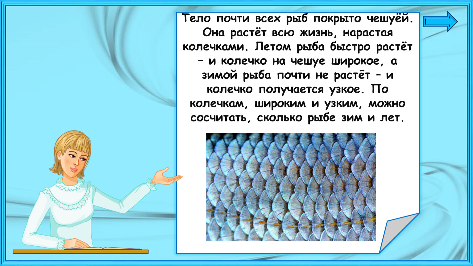 Тело почти всех рыб покрыто чешуёй. Она растёт всю жизнь, нарастая колечками. Летом рыба быстро растёт – и колечко на чешуе широкое, а зимой рыба почти не растёт – и колечко получается узкое. По колечкам, широким и узким, можно сосчитать, сколько рыбе зим и лет.