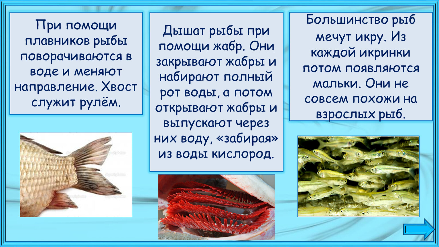 При помощи плавников рыбы поворачиваются в воде и меняют направление. Хвост служит рулём.