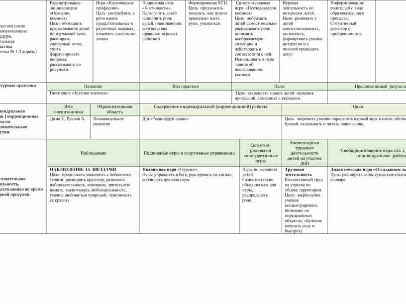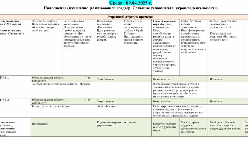 Понедельник 07.04. 2025 г. Обогащение предметно – развивающей среды по теме: «Космос». Оснащение ППРС необходимыми материалами для проведения дидактических игр и упражнений. |