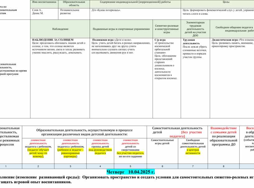 Четверг 10.04.2025 г. Пополнение (изменение развивающей среды): Организовать пространство и создать условия для самостоятельных сюжетно-ролевых игр. Обогащать игровой опыт воспитанников.