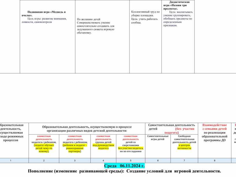 Пятница 08.11.2024 г. Пополнение (изменение развивающей среды): Организовать пространство и создать условия для самостоятельных сюжетно-ролевых игр. Обогащать игровой опыт воспитанников. |