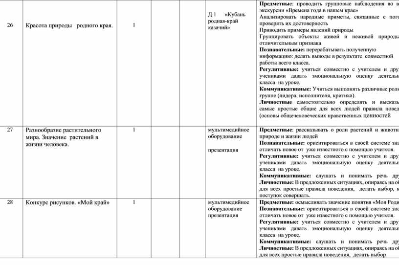 Предметные :подготавливать небольшие сообщения о прошлом родного края, известных людях, обычаях, праздников, на основе сведений, полученных во время экскурсий, бесед со старшими членами семьи Познавательные: умение объяснять мир. Регулятивные: учиться отличать верно выполненное задание от неверного. Коммуникативные : совместно договариваться о правилах поведения в природе обществе.. Личностные : в предложенных ситуациях, опираясь на общие для всех простые правила поведения, делать выбор, какой поступок совершить. |