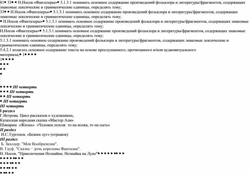 ІІІ четверть І раздел Г.Ветрова. Цикл рассказов о художниках, Казахская народная сказка «Мастер Али» Шакарим «Жизнь» «Человек похож то на волка, то на сыть» ІІ раздел И.С.Тургенев. «Бежин луг» (отрывок) ІІІ раздел Б. Заходер. "Моя Вообразилия". В. Гауф. "Сказка ⎻ дочь королевы Фантазии". Н. Носов. "Приключения Незнайки. Незнайка на Луне" |