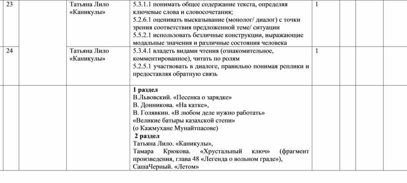 1 раздел В.Львовский. «Песенка о зарядке» В. Донникова. «На катке», В. Голявкин. «В любом деле нужно работать» «Великие батыры казахской степи» (о Кажмухане Мунайтпасове) 2 раздел Татьяна Лило. «Каникулы», Тамара Крюкова. «Хрустальный ключ» (фрагмент произведения, глава 48 «Легенда о вольном граде»), СашаЧерный. «Летом» |