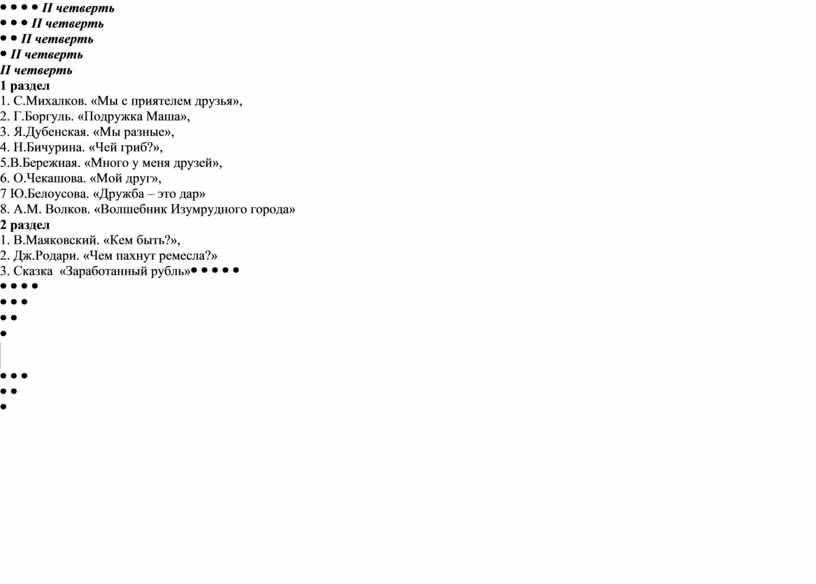І четверть 1 раздел 1. Н.А.Некрасов. «Дедушка Мазай и зайцы», 2. М.Ю. Лермонтов. «Гроза», 3. С.Есенин. «Буря», 4. Ф.Тютчев. «Весенняя гроза», «Зима недаром злится», 5. «Сказка о ветре» (из цикла «Новые сказки») 6. Абай «Лето» 2 раздел 1. Русская сказка «Мудрый отец», 2. Болгарская сказка «Сказка о бочке», 3. М. Скребцова. М.Скребцова «Сердце матери» 4. М.Жумабаев «Матери» |