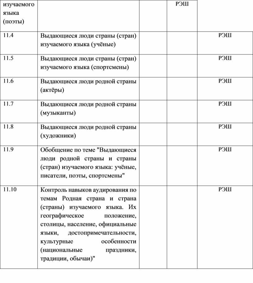 Раздел 11. Выдающиеся люди родной страны и страны/стран изучаемого языка, их вклад в науку и мировую культуру: государственные деятели, учёные, писатели, поэты, художники, музыканты, спортсмены (10 часов) |
