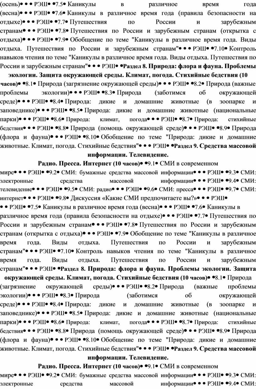 Раздел 8. Природа: флора и фауна. Проблемы экологии. Защита окружающей среды. Климат, погода. Стихийные бедствия (10 часов) |