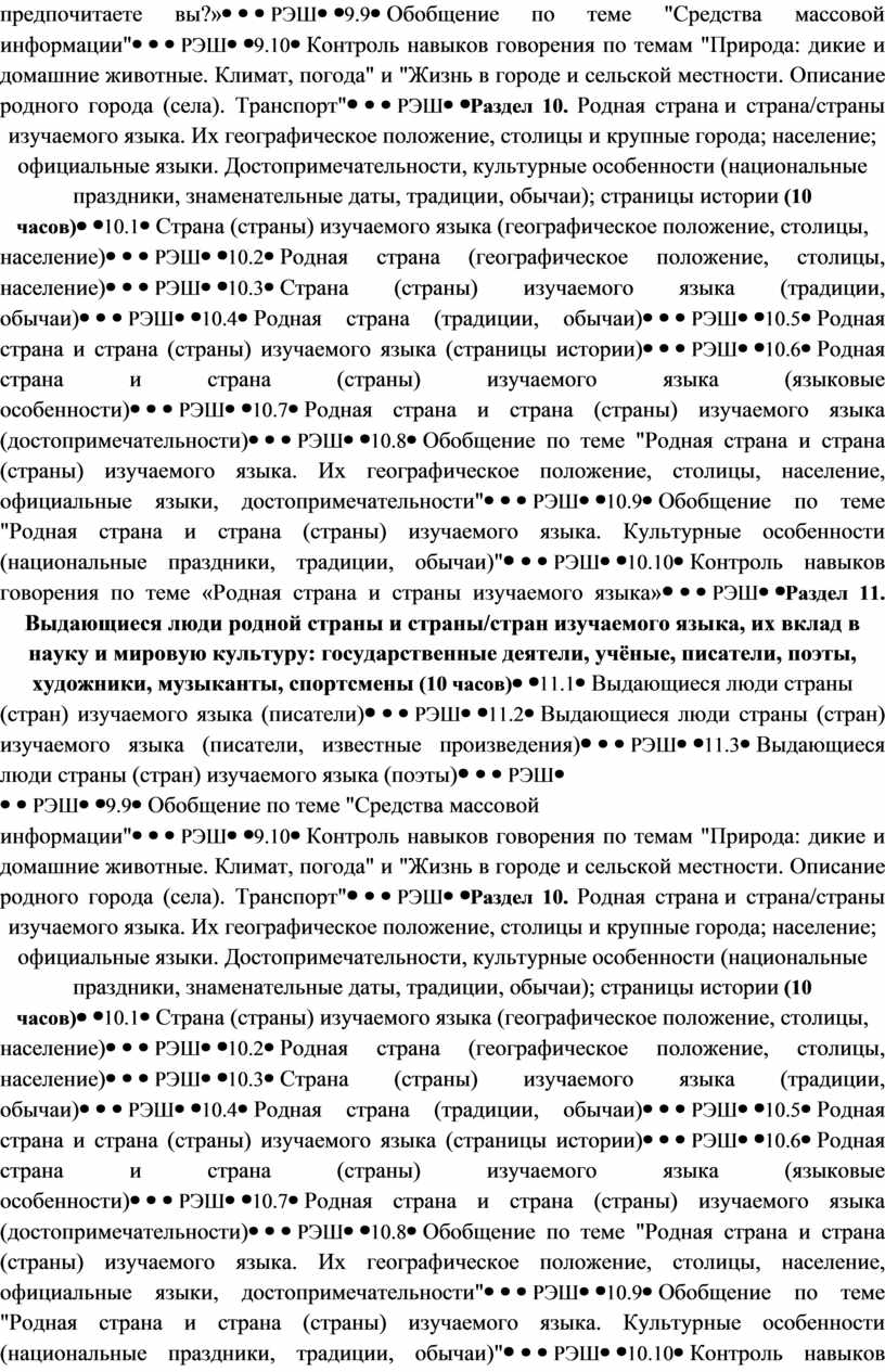 Раздел 10. Родная страна и страна/страны изучаемого языка. Их географическое положение, столицы и крупные города; население; официальные языки. Достопримечательности, культурные особенности (национальные праздники, знаменательные даты, традиции, обычаи); страницы истории (10 часов) |