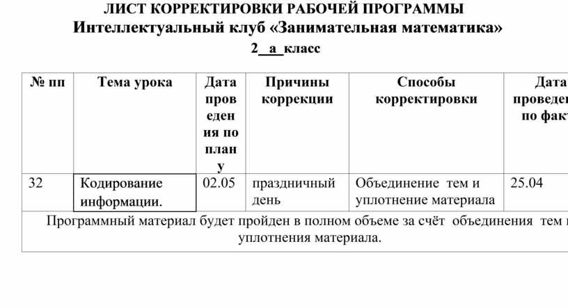 ЛИСТ КОРРЕКТИРОВКИ РАБОЧЕЙ ПРОГРАММЫ