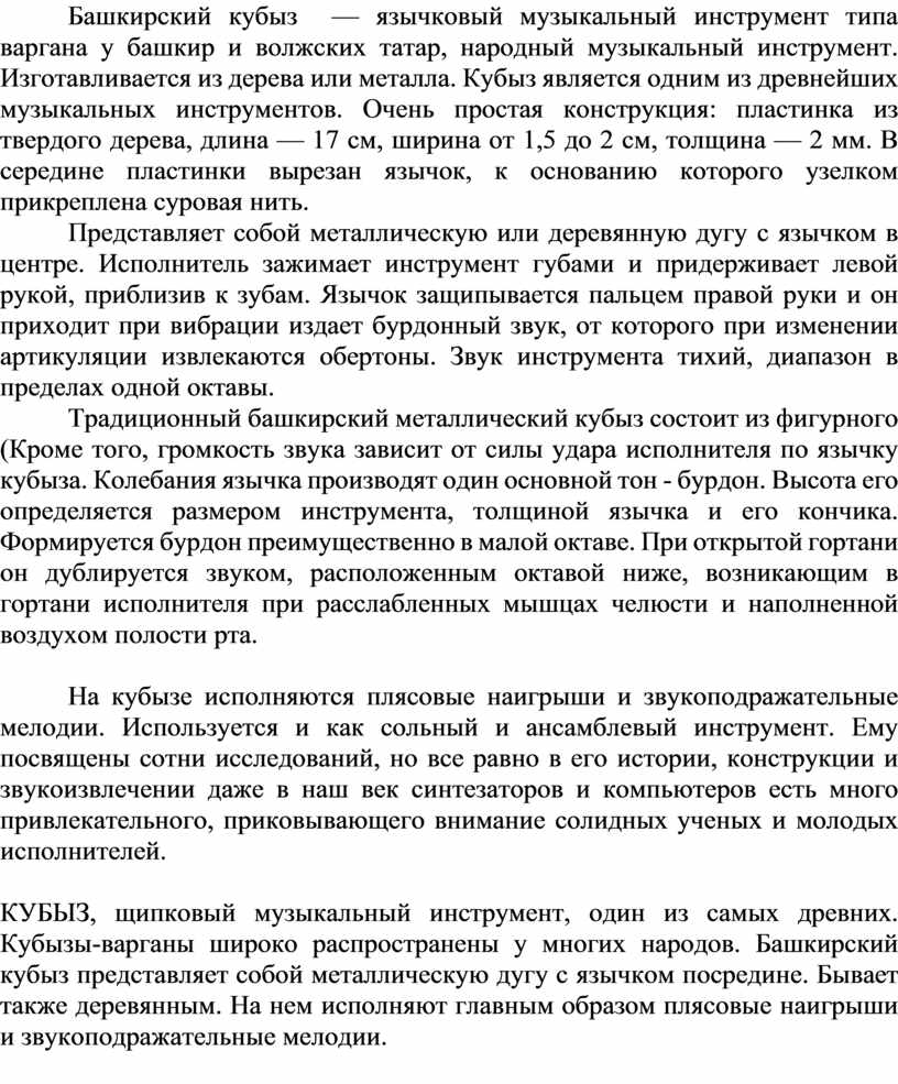 Традиционный башкирский металлический кубыз состоит из фигурного (Кроме того, громкость звука зависит от силы удара исполнителя по язычку кубыза. Колебания язычка производят один основной тон - бурдон. Высота его определяется размером инструмента, толщиной язычка и его кончика. Формируется бурдон преимущественно в малой октаве. При открытой гортани он дублируется звуком, расположенным октавой ниже, возникающим в гортани исполнителя при расслабленных мышцах челюсти и наполненной воздухом полости рта.