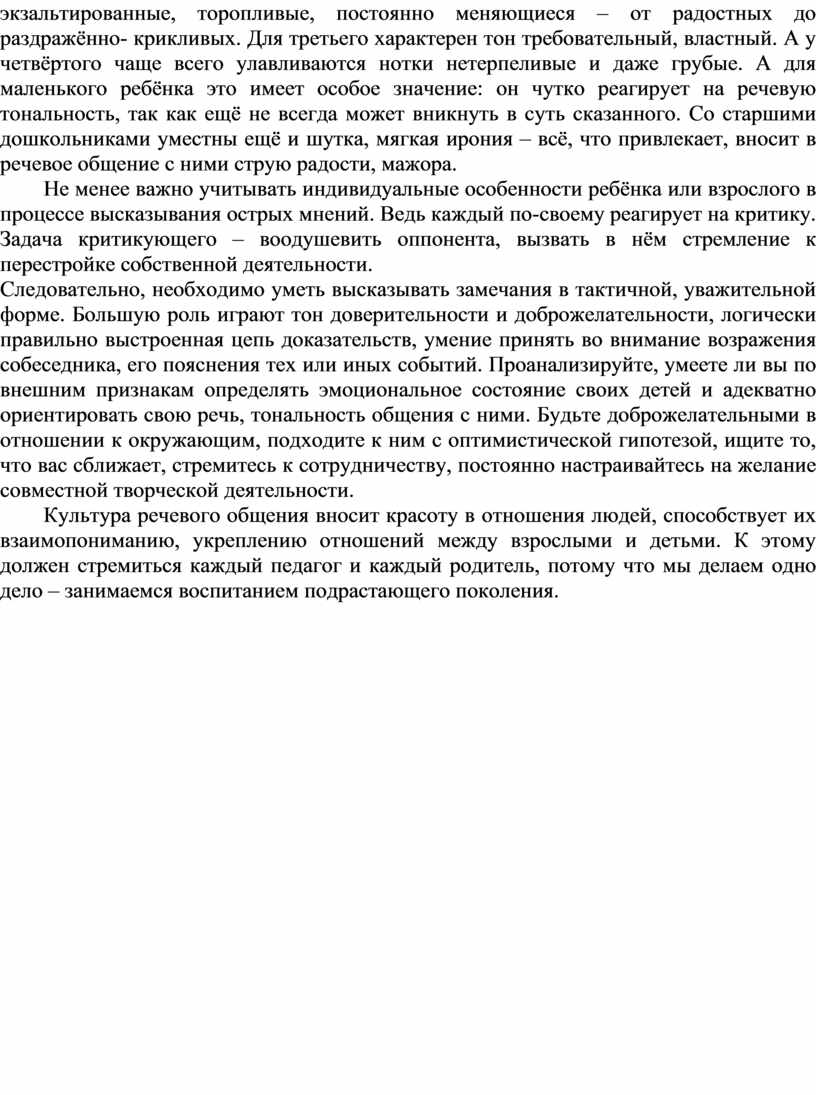 Напрашивается вывод: всем, кому доверено воспитание подрастающего поколения, важно быть предельно взыскательными к собственному речевому поведению – на нас равняются дети. Допустимо ли, чтобы настроение взрослого отражалось на его речевом поведении? Вправе ли он «включать» в своё настроение детей? Ответ однозначен: нет, нет и нет! Любой педагог или родитель всегда должен быть немного актёром. А это значит уметь владеть собой, быть требовательным к собственному слову, уметь придать ему нужный эмоциональный оттенок и пользоваться им как инструментом, воздействующим на собеседника.