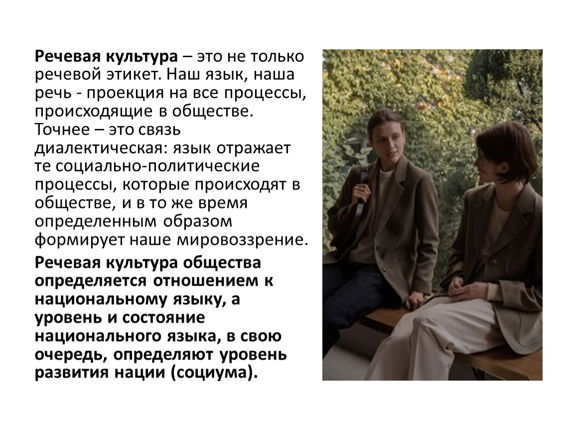 Речевая культура – это не только речевой этикет. Наш язык, наша речь - проекция на все процессы, происходящие в обществе. Точнее – это связь диалектическая: язык отражает те социально-политические процессы, которые происходят в обществе, и в то же время определенным образом формирует наше мировоззрение.